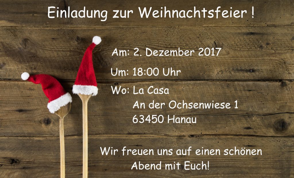 Hier können Sie Weihnachtsfeier in Hanau direkt kostenlos kontaktieren und buchen. Weihnachtsfeier Hanau Weihnachtsfeier Gießen Weihnachtsfeier Marburg Weihnachtsfeier Fulda Rüsselsheim am Main. Eine kleine Zusammenfassung der Weihnachtsfeier unserer Junioren im Nachbarschaftshaus in Hanau-Lamboy.