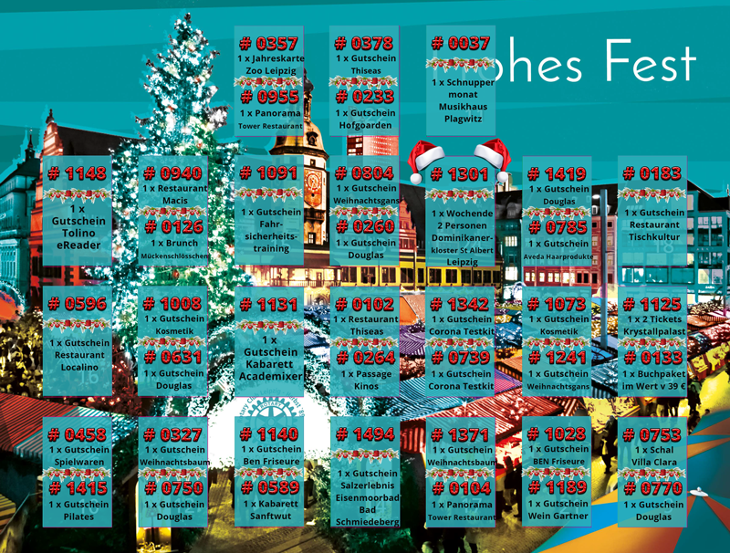 30 Sachpreise zum Beispiel ein Gutschein für Gewandhaus-Konzert Jahreskarten für den Leipziger Zoo Weihnachstbäume Weihnachtsgans Rennbahnbesuch inklusive 3-Gänge-Menü Wochenende im Dominikaner-Kloster. Mindestens 15000 Euro zugunsten. Tag in Folge unter 100.